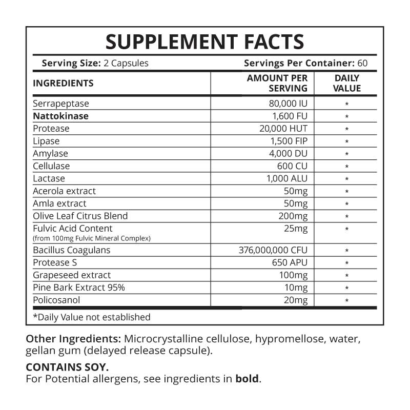 - Contains serrapeptase (80,000 IU) and nattokinase (1,600 FU) – systemic enzymes.*